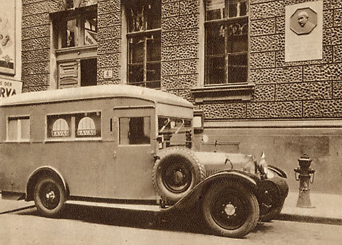 | Aus dem Jahr 1934 stammt diese Fotografie, die einen „Schallaufzeichnungswagen“ der RAVAG vor dem RAVAG-Haus zeigt. Rechts oben ist die Plakette zu sehen.