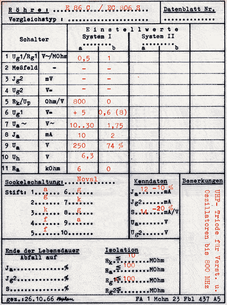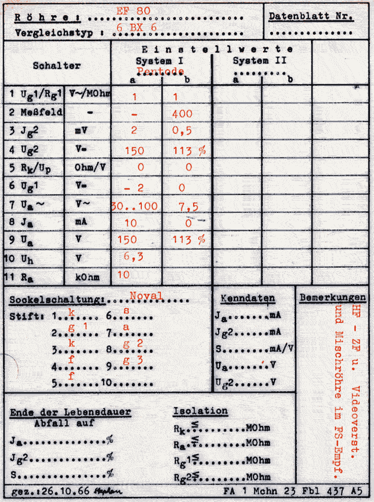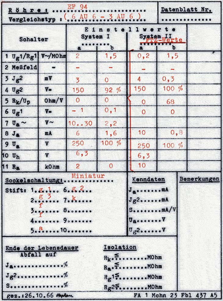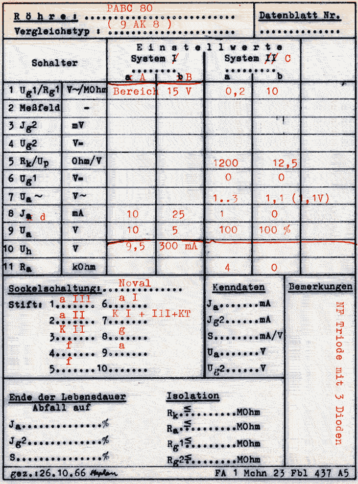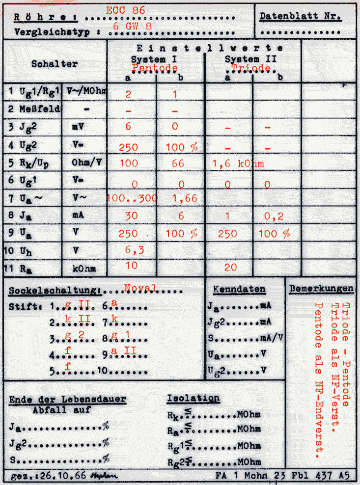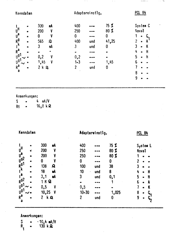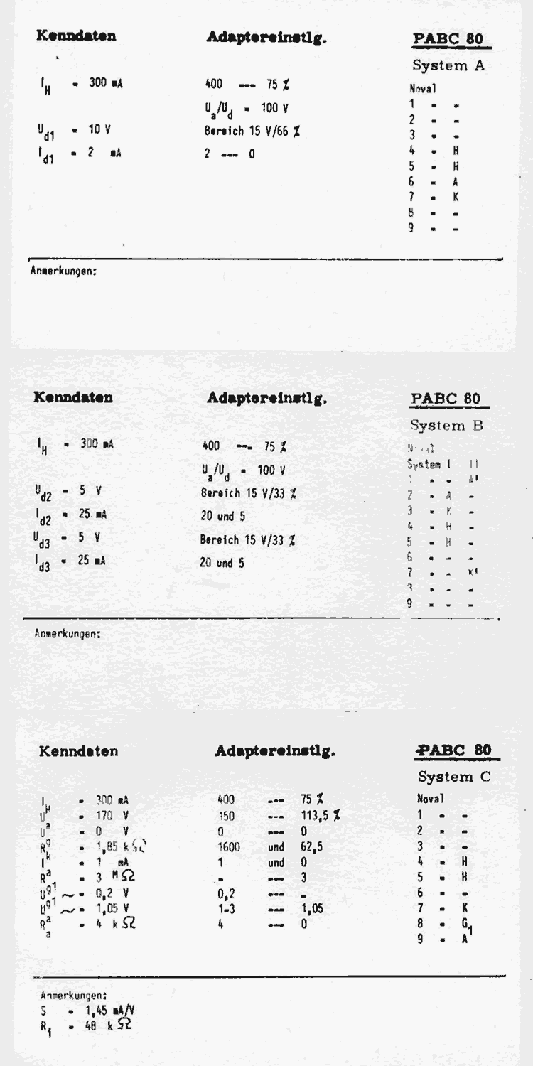Mit meinem Universaladapter wurden drei Ringordner mit Einstellblättern mitgegeben. Zwei grüne mit DIN-A6-Blättern (E- und P-Röhren) und ein roter mit DIN-A5-Blättern. Gelistet sind alle Einstellblätter und alle Verweise auf erwähnte Vergleichstypen. Die Blätter, die in Klammern stehen, enthalten keine ausreichenden Werte für die Messungen. Sie wurden trotzdem mit aufgenommen, damit gleichzeitig ein Überblick gegeben wird, welche Röhren die Deutsche Bundespost 1966 verwendete.