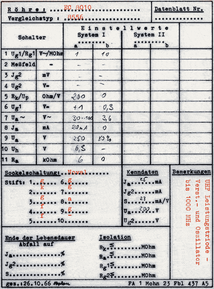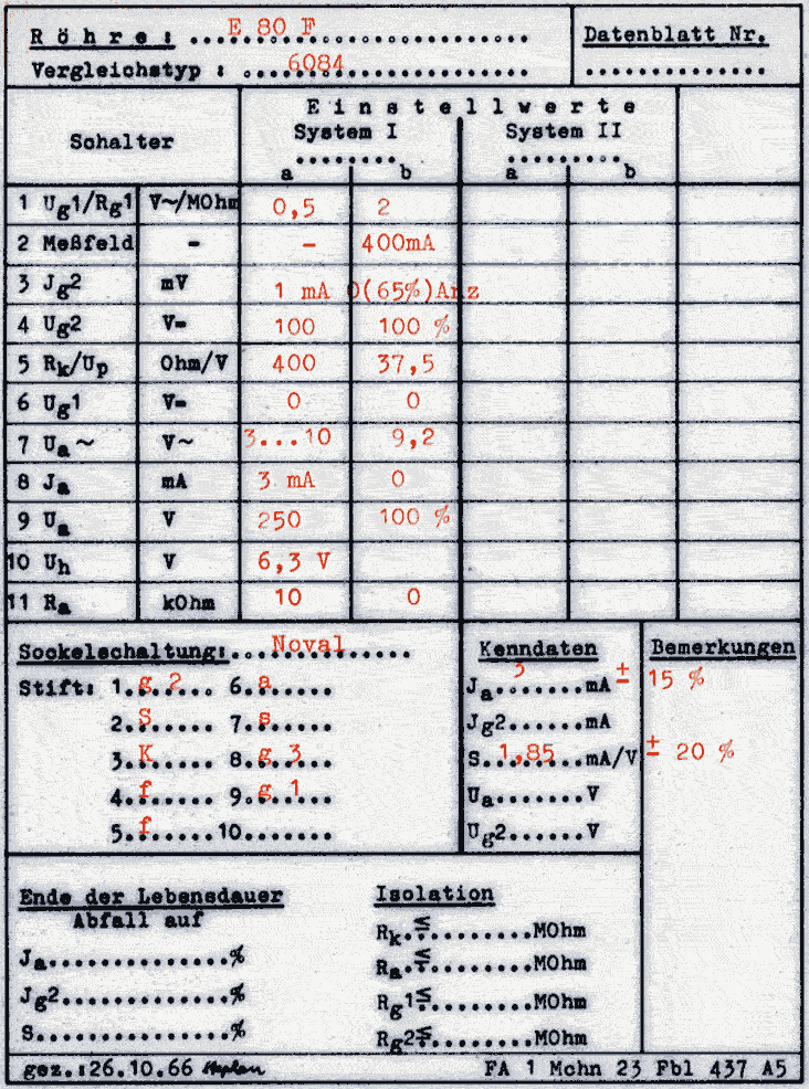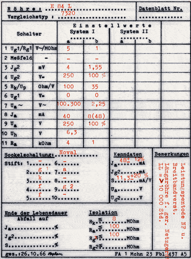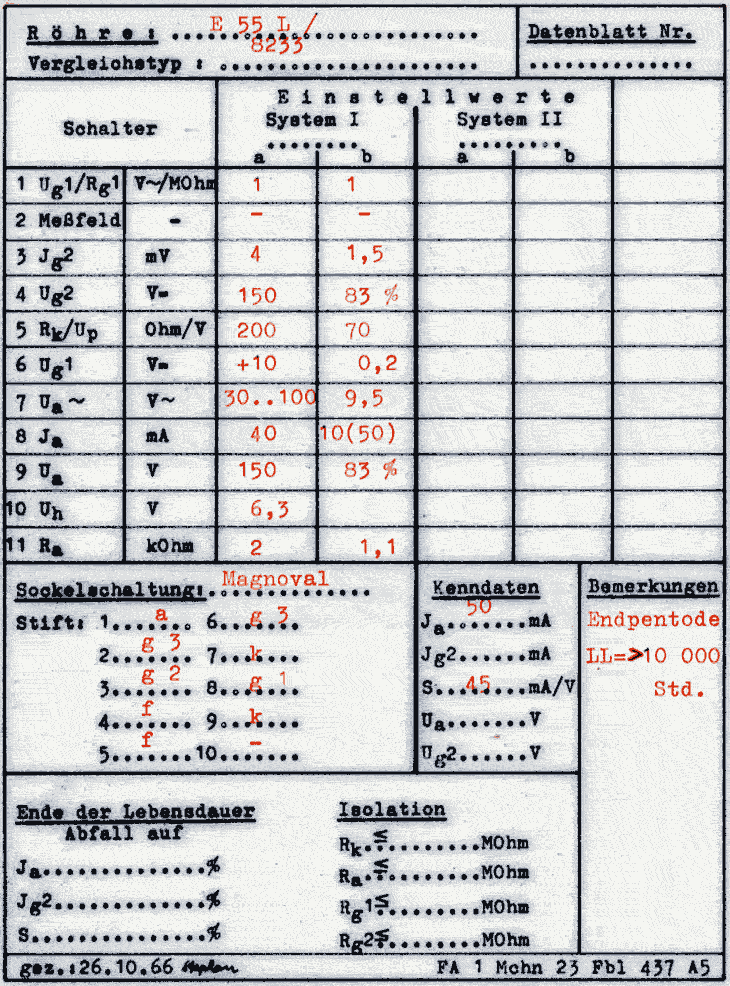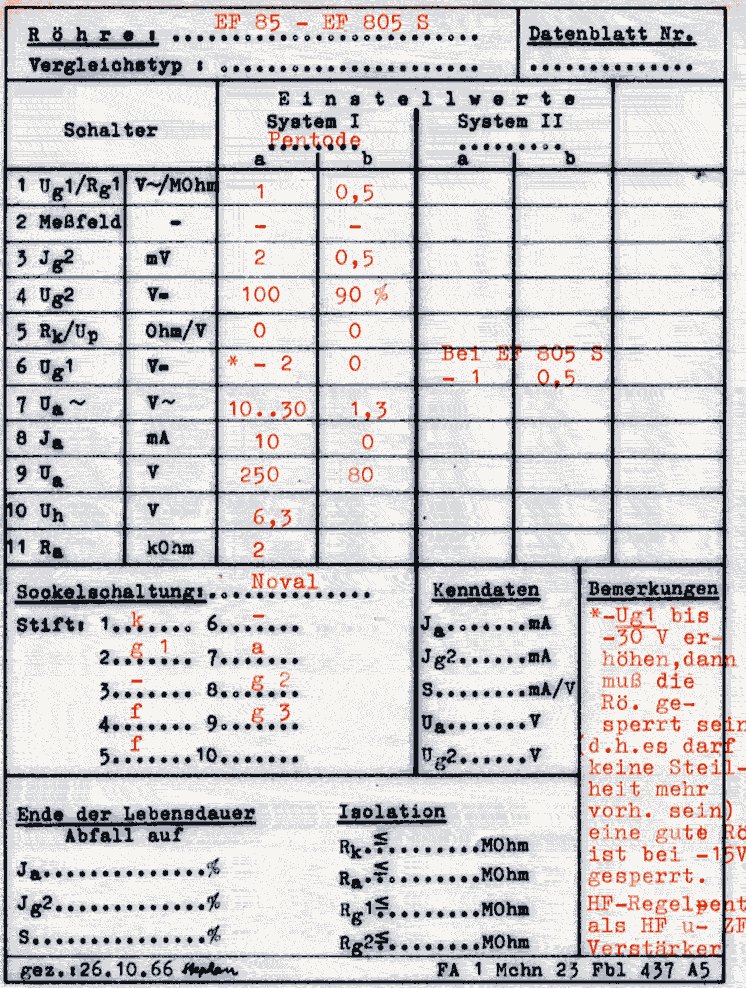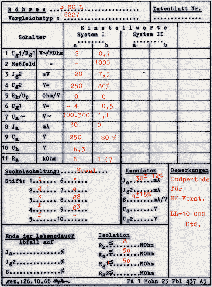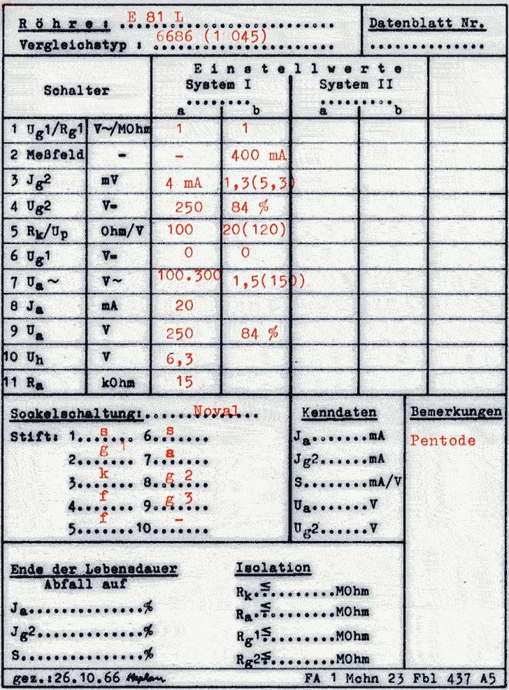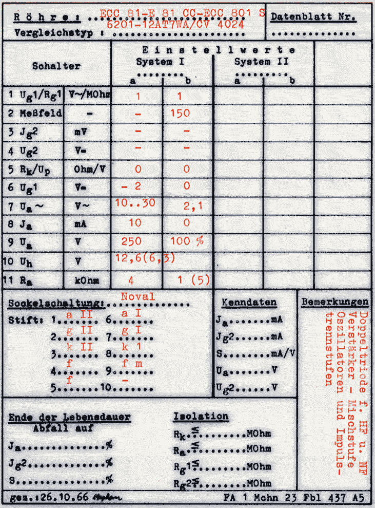 Mit meinem Universaladapter wurden drei Ringordner mit Einstellblättern mitgegeben. Zwei grüne mit DIN-A6-Blättern (E- und P-Röhren) und ein roter mit DIN-A5-Blättern. Gelistet sind alle Einstellblätter und alle Verweise auf erwähnte Vergleichstypen. Die Blätter, die in Klammern stehen, enthalten keine ausreichenden Werte für die Messungen. Sie wurden trotzdem mit aufgenommen, damit gleichzeitig ein Überblick gegeben wird, welche Röhren die Deutsche Bundespost 1966 verwendete.