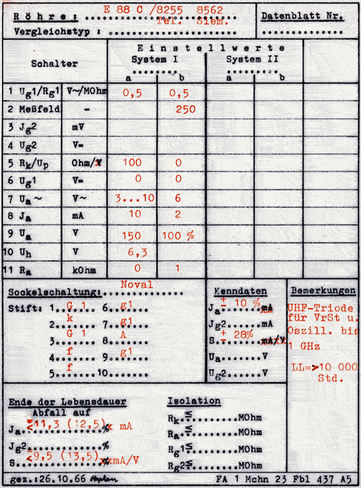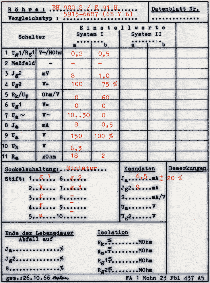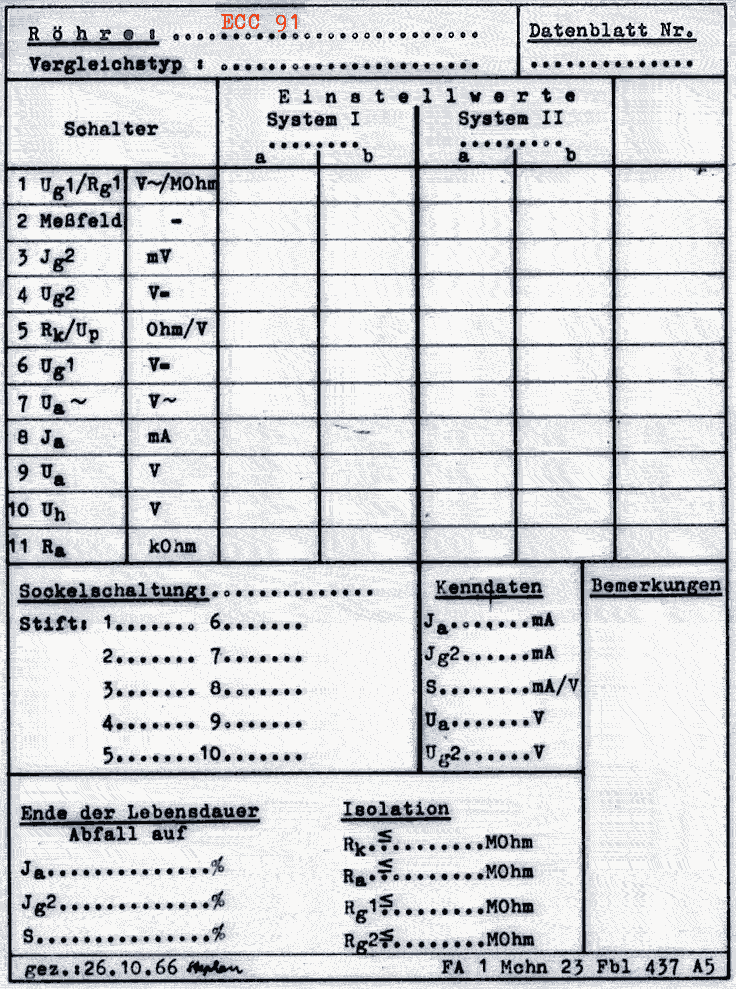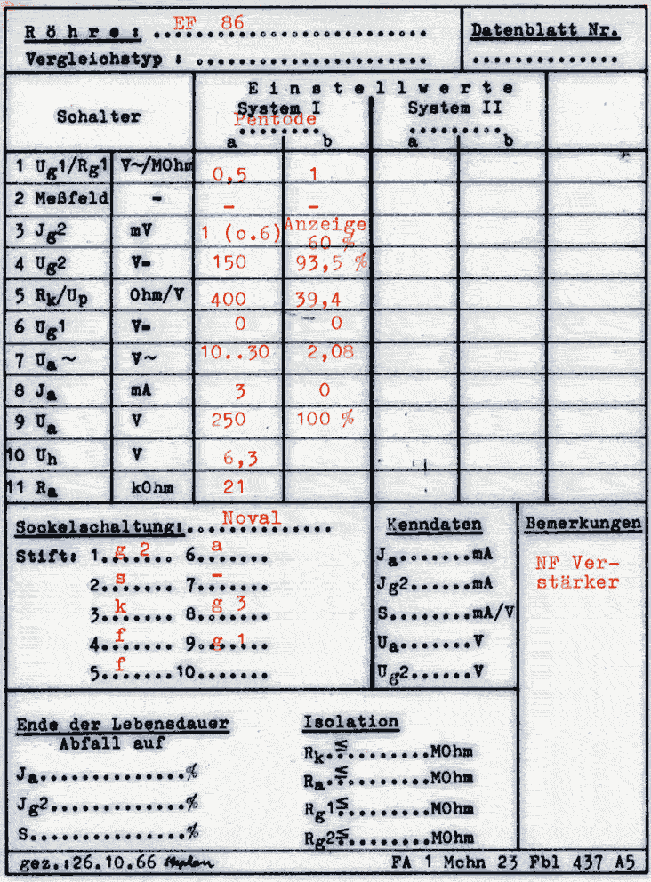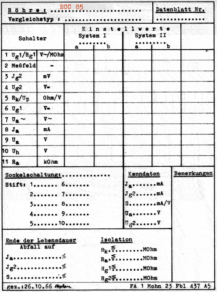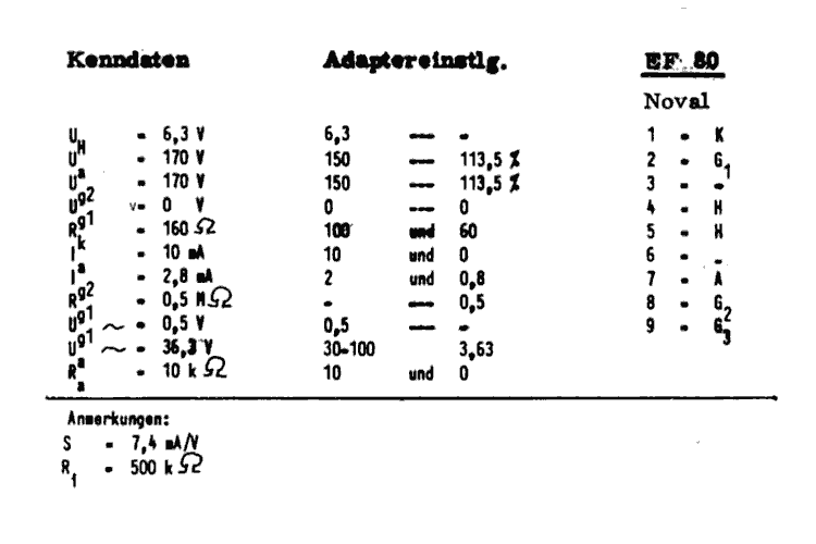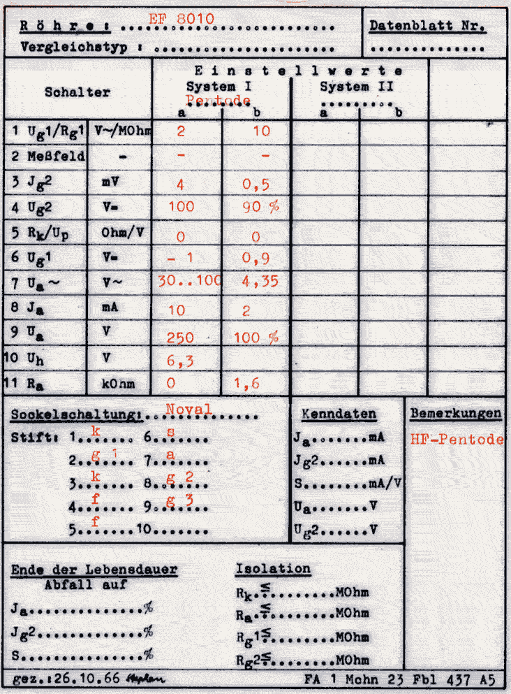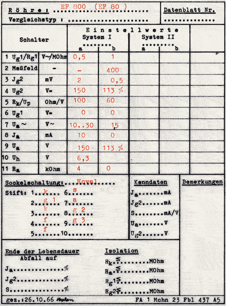 Mit meinem Universaladapter wurden drei Ringordner mit Einstellblättern mitgegeben. Zwei grüne mit DIN-A6-Blättern (E- und P-Röhren) und ein roter mit DIN-A5-Blättern. Gelistet sind alle Einstellblätter und alle Verweise auf erwähnte Vergleichstypen. Die Blätter, die in Klammern stehen, enthalten keine ausreichenden Werte für die Messungen. Sie wurden trotzdem mit aufgenommen, damit gleichzeitig ein Überblick gegeben wird, welche Röhren die Deutsche Bundespost 1966 verwendete.