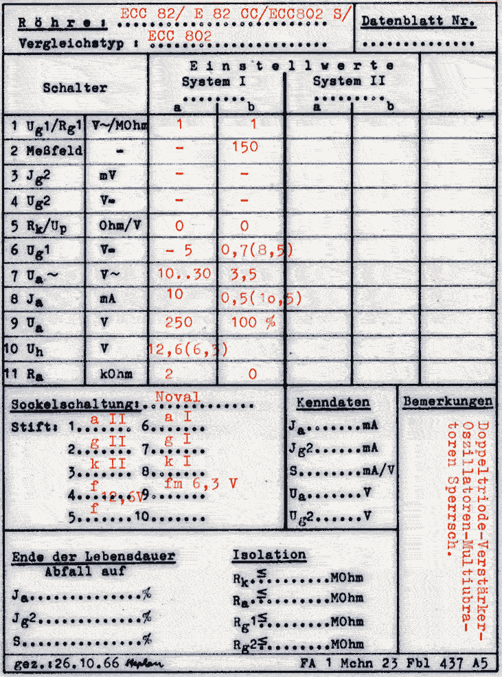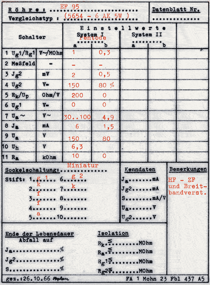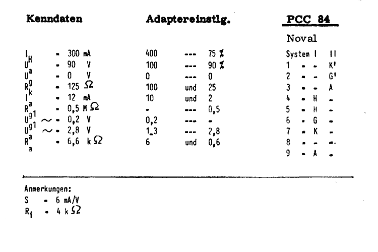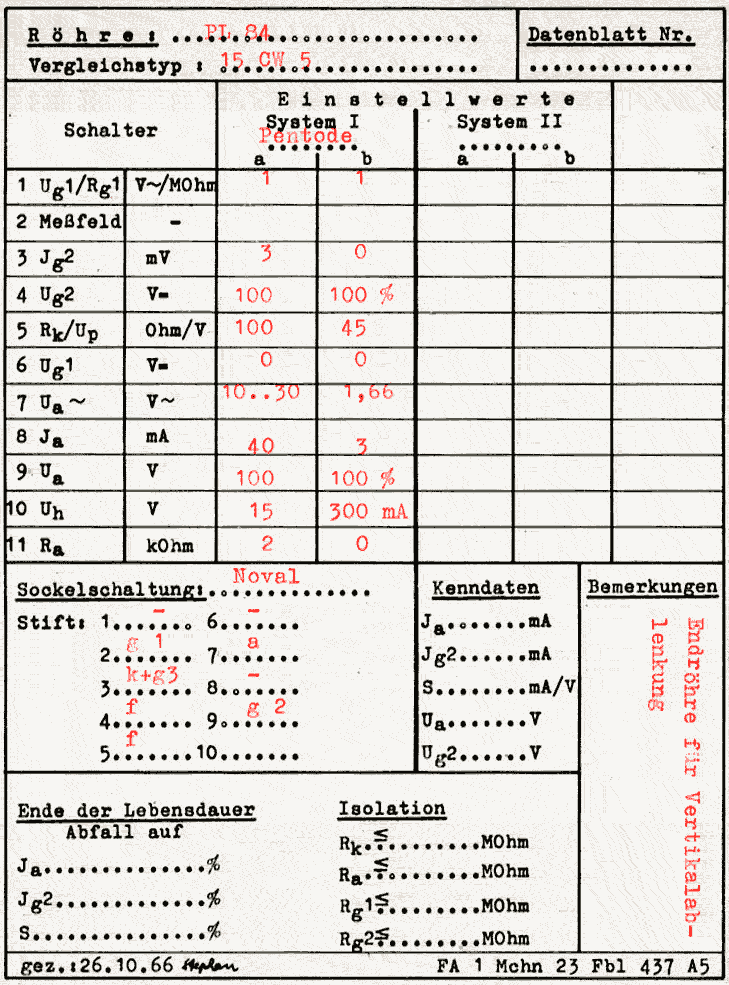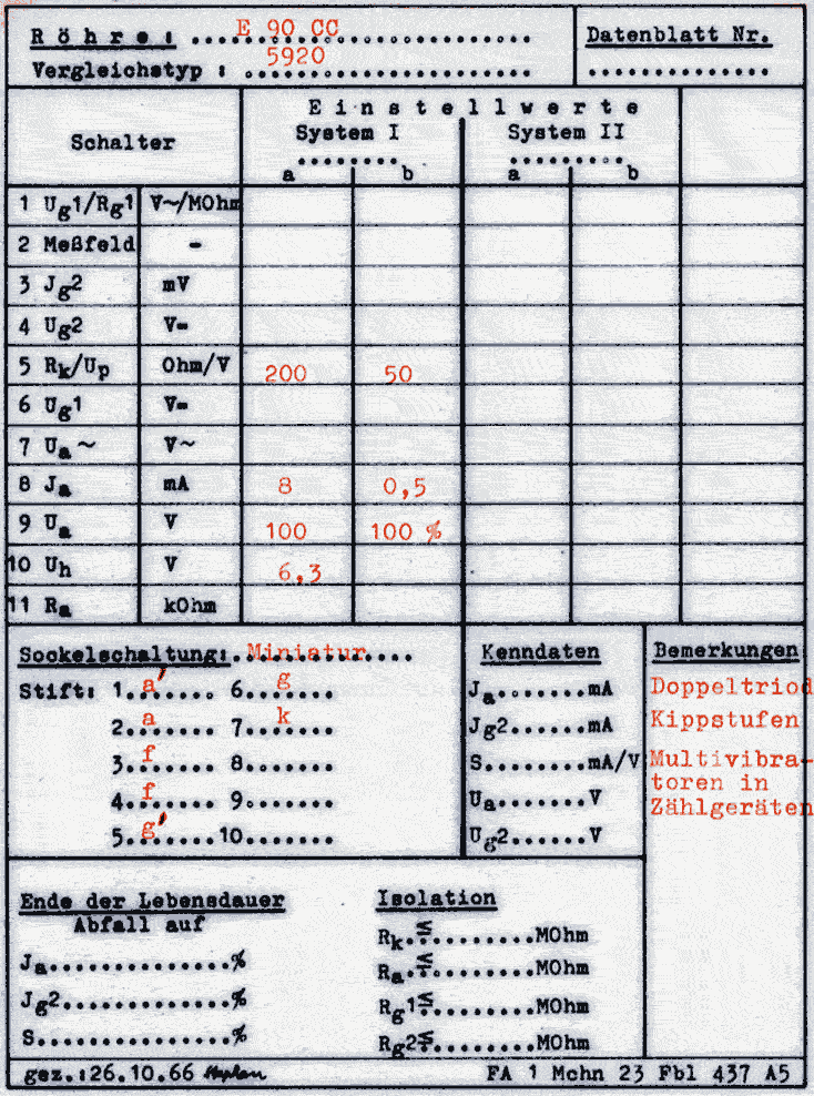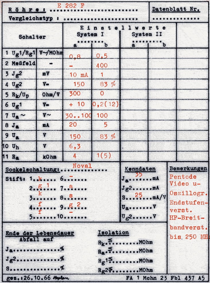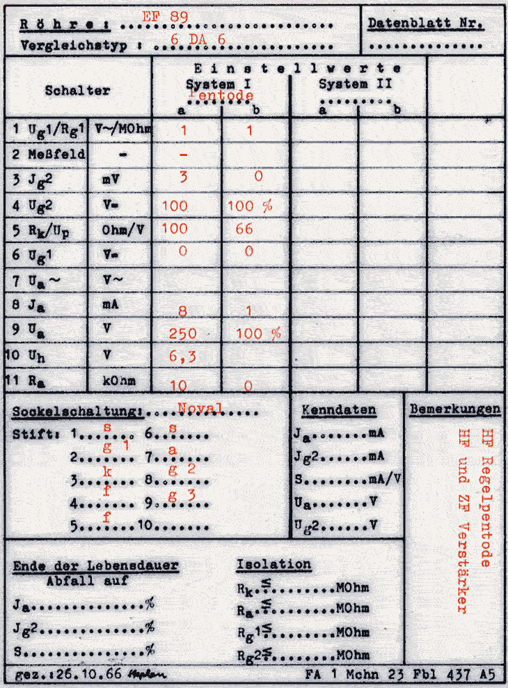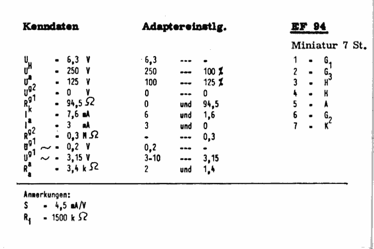 Mit meinem Universaladapter wurden drei Ringordner mit Einstellblättern mitgegeben. Zwei grüne mit DIN-A6-Blättern (E- und P-Röhren) und ein roter mit DIN-A5-Blättern. Gelistet sind alle Einstellblätter und alle Verweise auf erwähnte Vergleichstypen. Die Blätter, die in Klammern stehen, enthalten keine ausreichenden Werte für die Messungen. Sie wurden trotzdem mit aufgenommen, damit gleichzeitig ein Überblick gegeben wird, welche Röhren die Deutsche Bundespost 1966 verwendete.