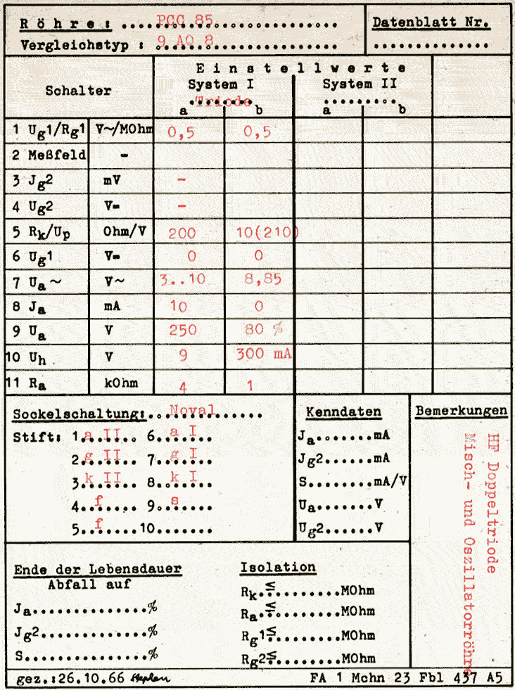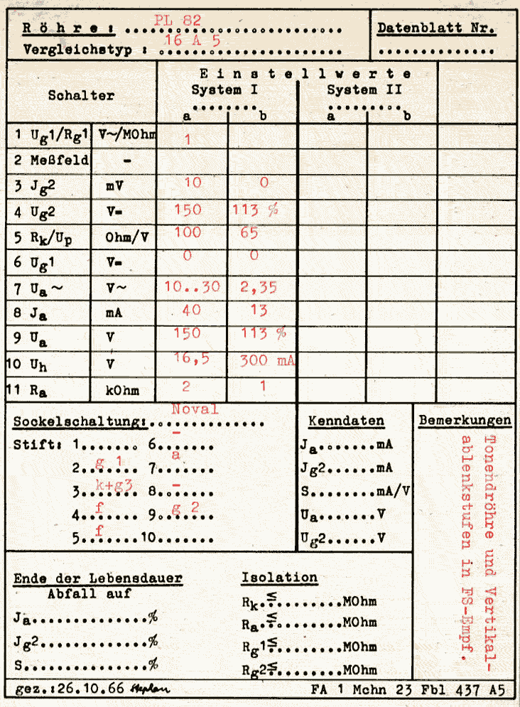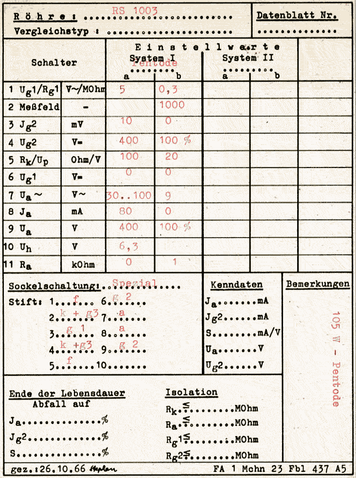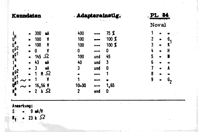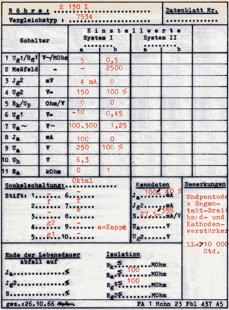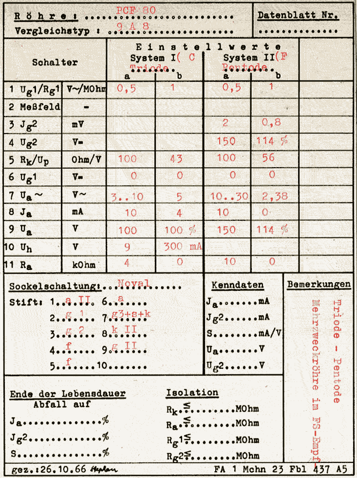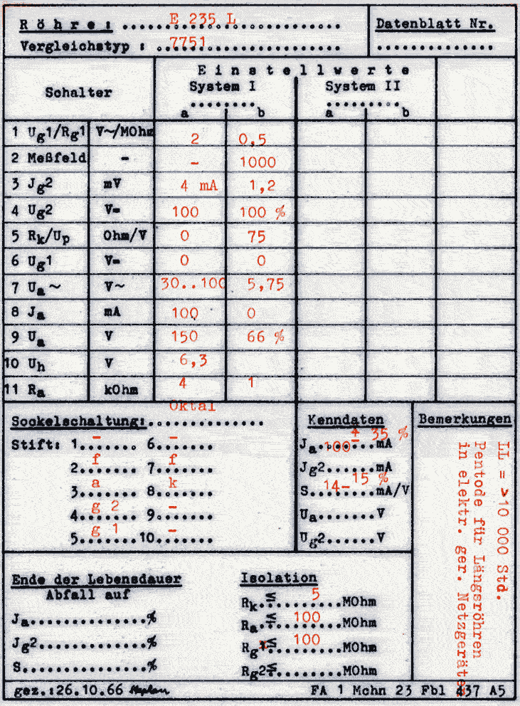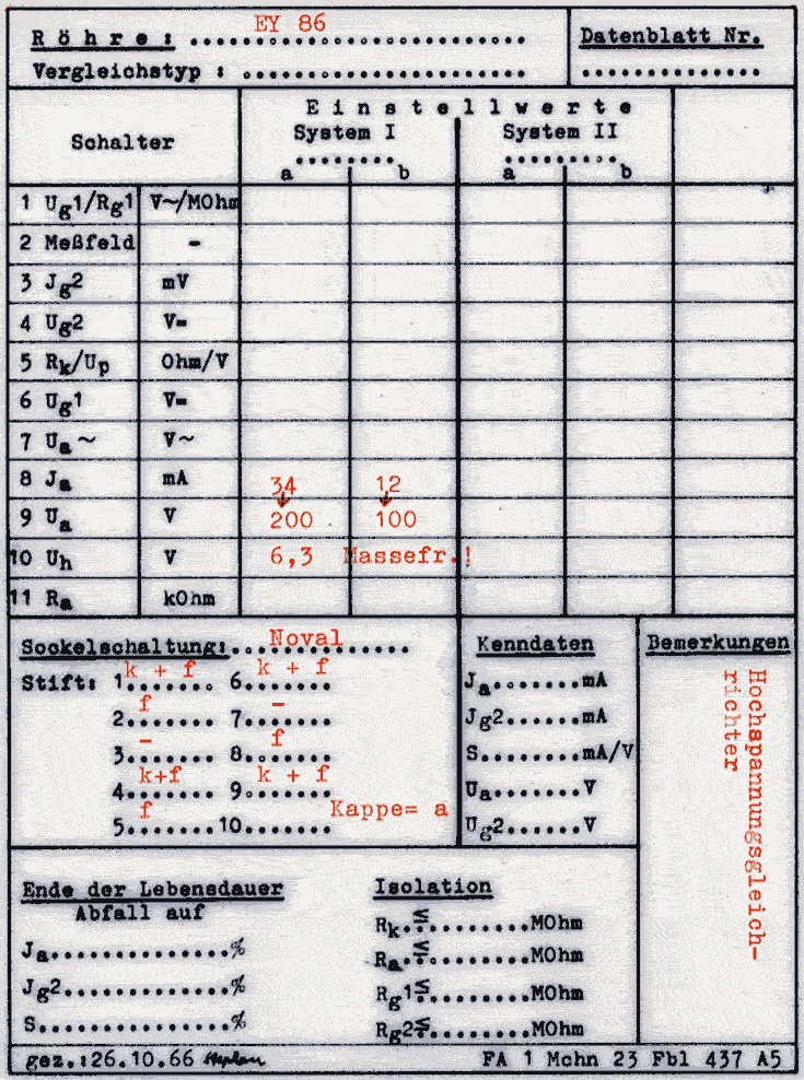 Mit meinem Universaladapter wurden drei Ringordner mit Einstellblättern mitgegeben. Zwei grüne mit DIN-A6-Blättern (E- und P-Röhren) und ein roter mit DIN-A5-Blättern. Gelistet sind alle Einstellblätter und alle Verweise auf erwähnte Vergleichstypen. Die Blätter, die in Klammern stehen, enthalten keine ausreichenden Werte für die Messungen. Sie wurden trotzdem mit aufgenommen, damit gleichzeitig ein Überblick gegeben wird, welche Röhren die Deutsche Bundespost 1966 verwendete.