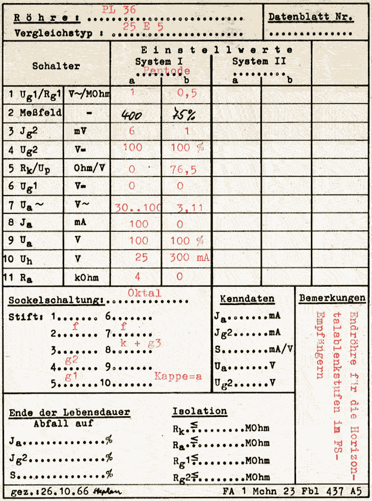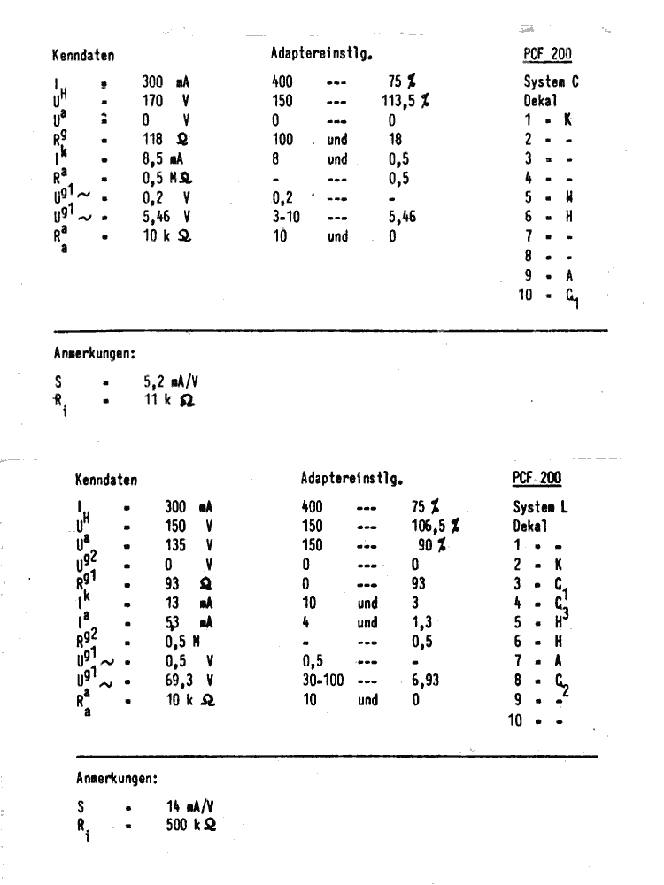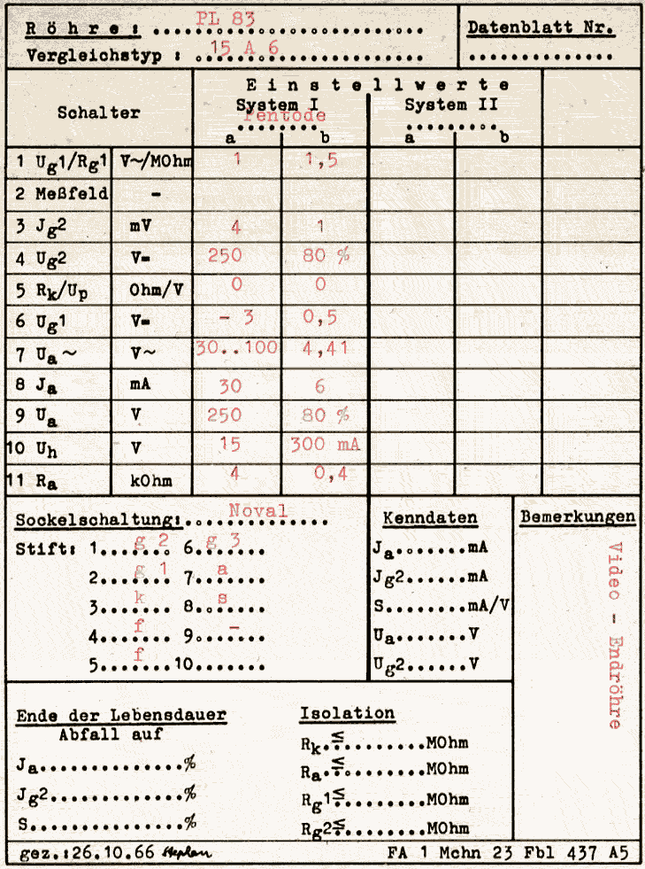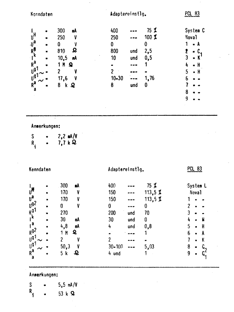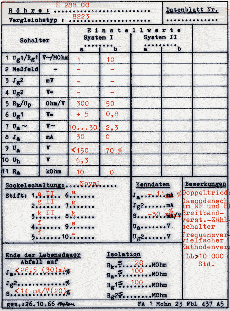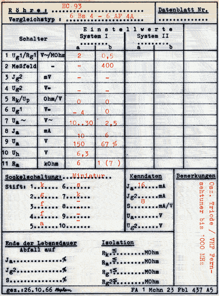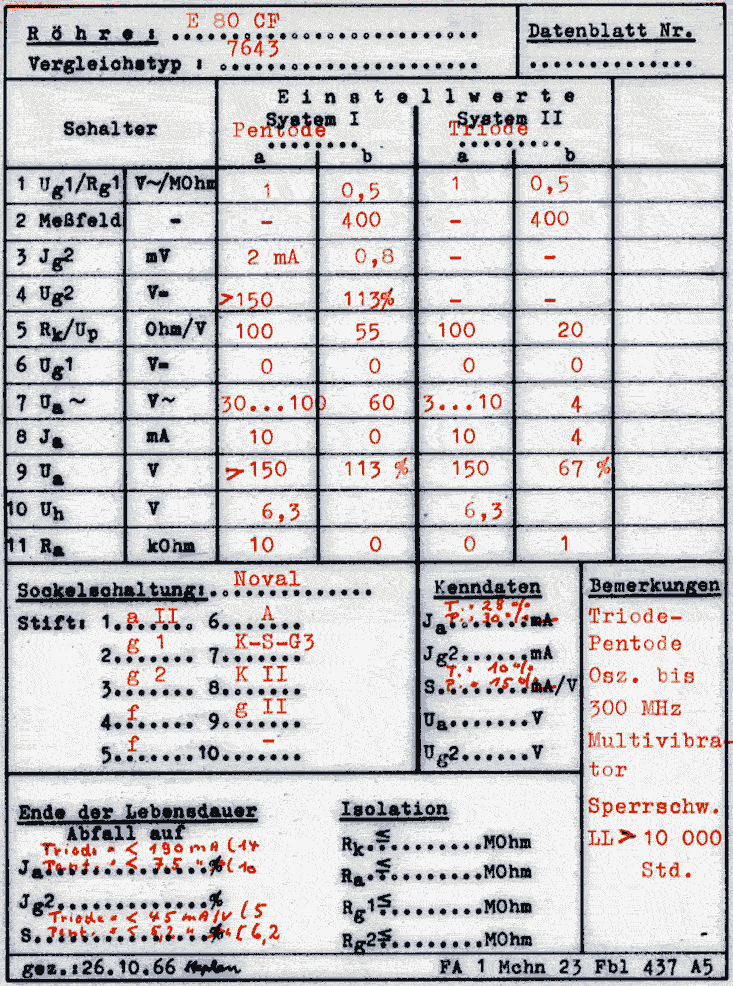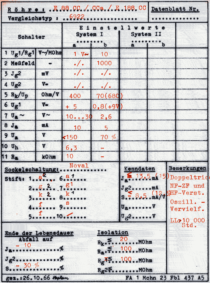 Mit meinem Universaladapter wurden drei Ringordner mit Einstellblättern mitgegeben. Zwei grüne mit DIN-A6-Blättern (E- und P-Röhren) und ein roter mit DIN-A5-Blättern. Gelistet sind alle Einstellblätter und alle Verweise auf erwähnte Vergleichstypen. Die Blätter, die in Klammern stehen, enthalten keine ausreichenden Werte für die Messungen. Sie wurden trotzdem mit aufgenommen, damit gleichzeitig ein Überblick gegeben wird, welche Röhren die Deutsche Bundespost 1966 verwendete.
