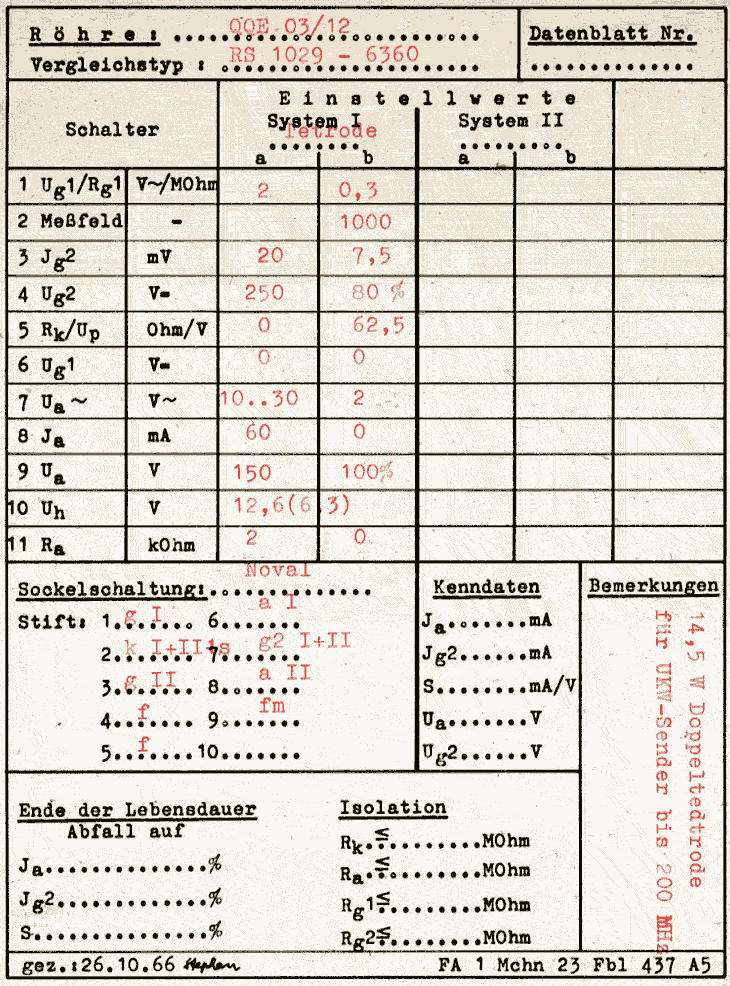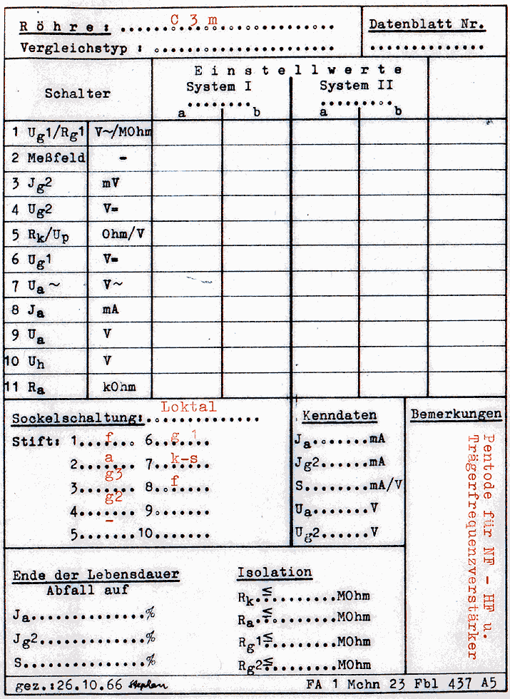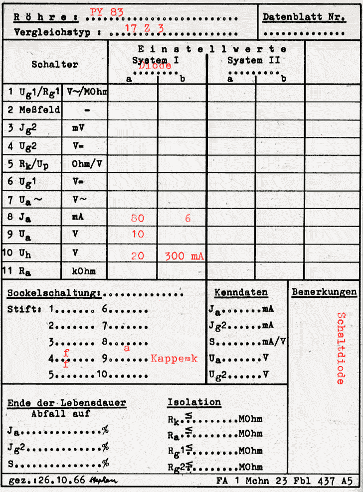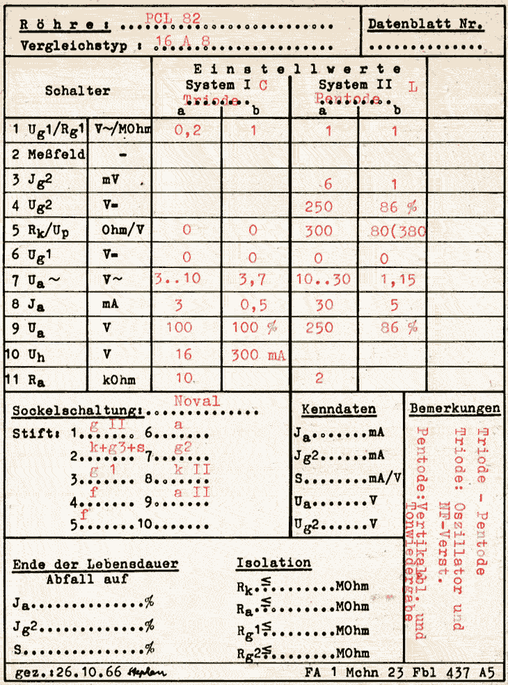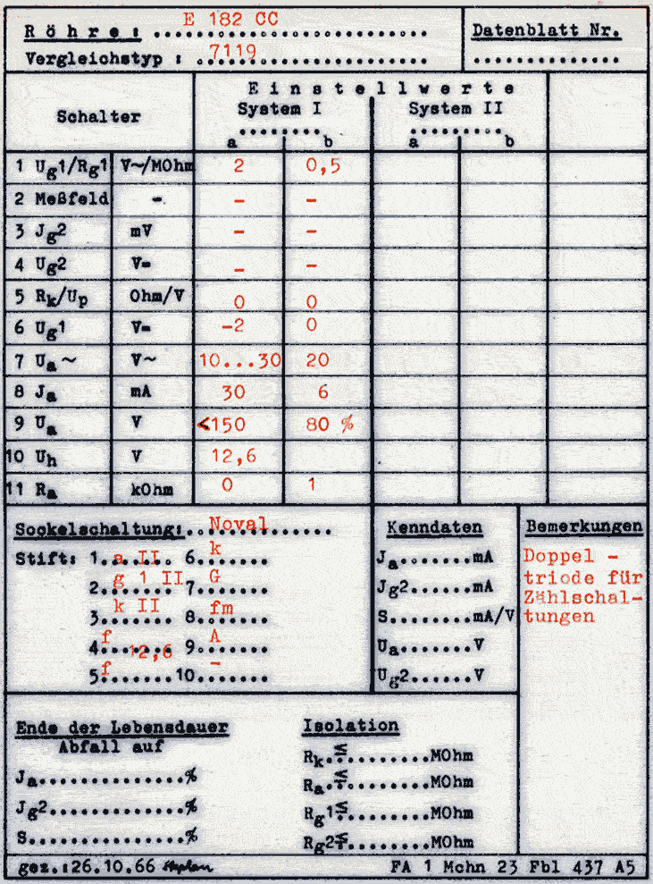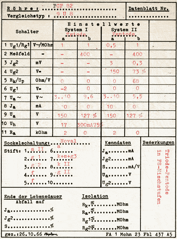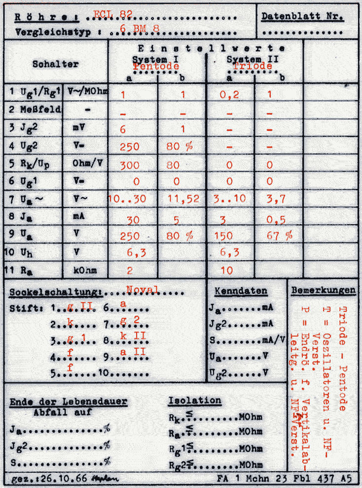 Mit meinem Universaladapter wurden drei Ringordner mit Einstellblättern mitgegeben. Zwei grüne mit DIN-A6-Blättern (E- und P-Röhren) und ein roter mit DIN-A5-Blättern. Gelistet sind alle Einstellblätter und alle Verweise auf erwähnte Vergleichstypen. Die Blätter, die in Klammern stehen, enthalten keine ausreichenden Werte für die Messungen. Sie wurden trotzdem mit aufgenommen, damit gleichzeitig ein Überblick gegeben wird, welche Röhren die Deutsche Bundespost 1966 verwendete.