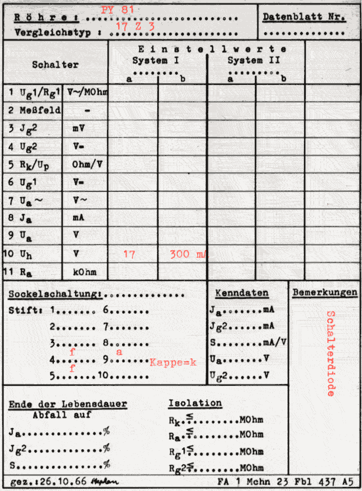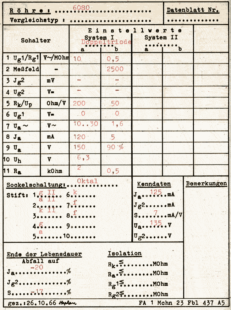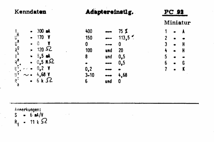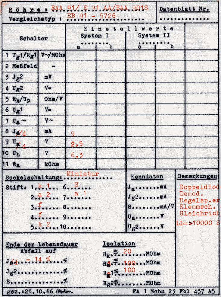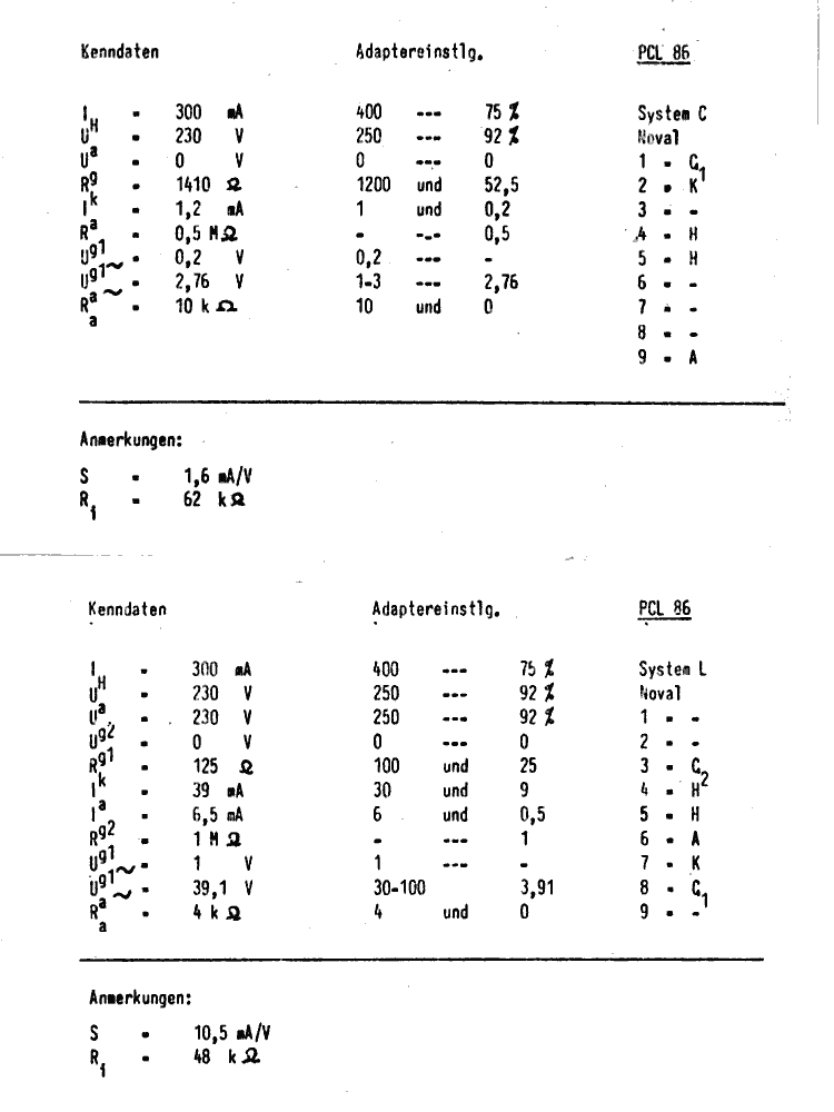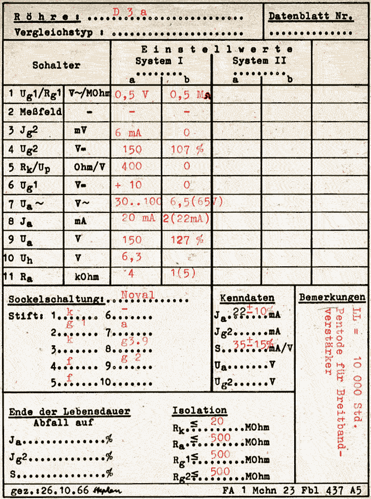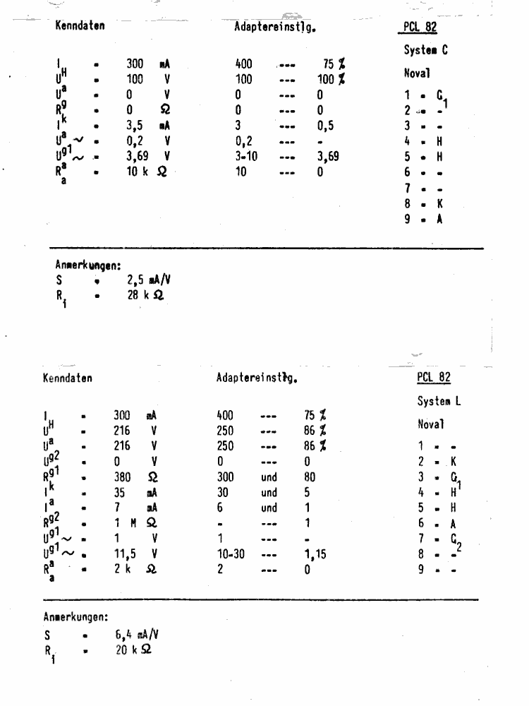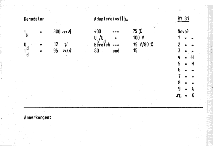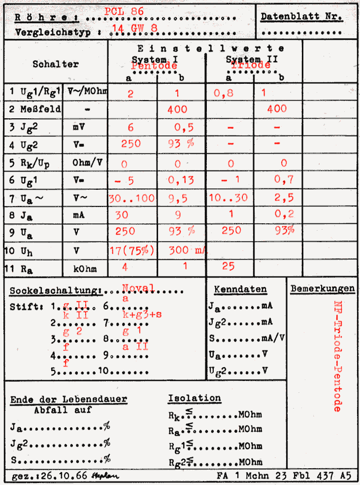Mit meinem Universaladapter wurden drei Ringordner mit Einstellblättern mitgegeben. Zwei grüne mit DIN-A6-Blättern (E- und P-Röhren) und ein roter mit DIN-A5-Blättern. Gelistet sind alle Einstellblätter und alle Verweise auf erwähnte Vergleichstypen. Die Blätter, die in Klammern stehen, enthalten keine ausreichenden Werte für die Messungen. Sie wurden trotzdem mit aufgenommen, damit gleichzeitig ein Überblick gegeben wird, welche Röhren die Deutsche Bundespost 1966 verwendete.
