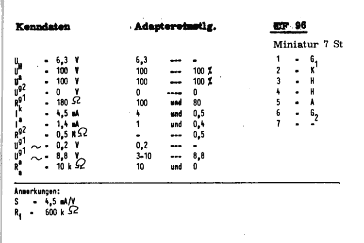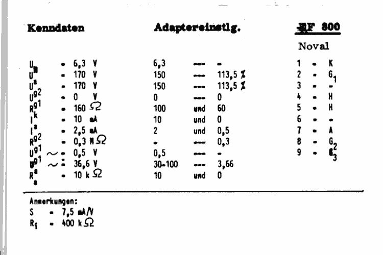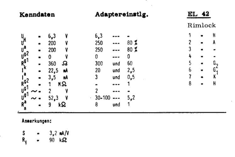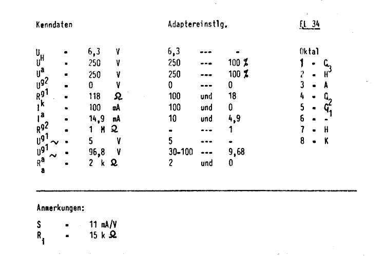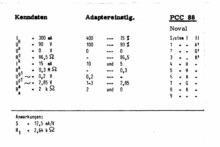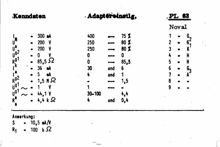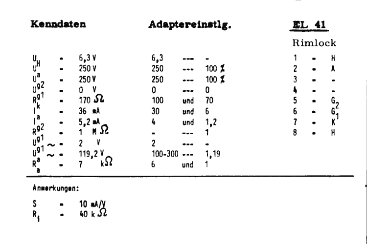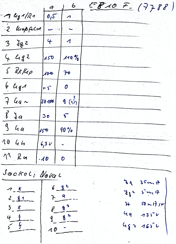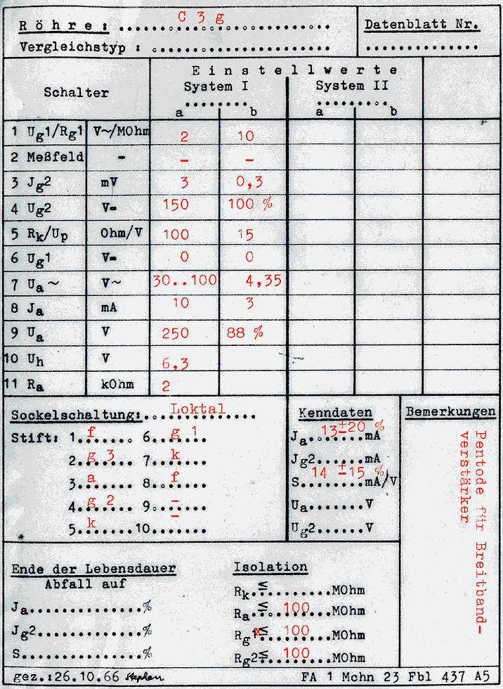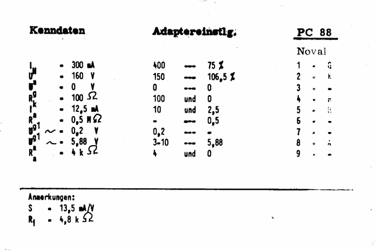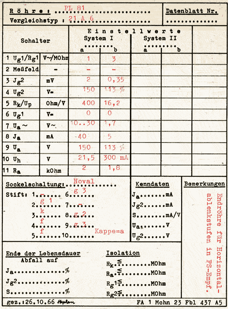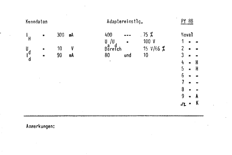 Mit meinem Universaladapter wurden drei Ringordner mit Einstellblättern mitgegeben. Zwei grüne mit DIN-A6-Blättern (E- und P-Röhren) und ein roter mit DIN-A5-Blättern. Gelistet sind alle Einstellblätter und alle Verweise auf erwähnte Vergleichstypen. Die Blätter, die in Klammern stehen, enthalten keine ausreichenden Werte für die Messungen. Sie wurden trotzdem mit aufgenommen, damit gleichzeitig ein Überblick gegeben wird, welche Röhren die Deutsche Bundespost 1966 verwendete.