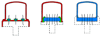 Links: Bauform bis 1948 (Im Foto links). Stahl Fernico Glas (gestrichelt: Sockelteil aus Bakelit) |