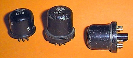 EBF 11, seit 1938 oben Telefunken (Links: nach 1945, Mitte und rechts: vor 1945), unten RFT mit Glaskolben (1953/54). Demodulator-Duodiode und Zwischenfrequenzverstärkerpentode für Rundfunkempfänger. Heizung: 6,3 V und 0,2 A indirekt Für jedes Diodensystem: Pentode: |