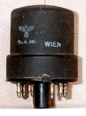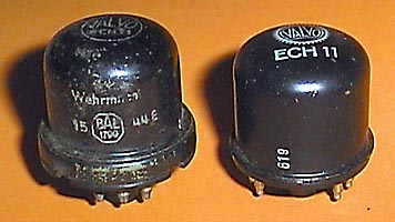 Und hier noch eine besonders seltene ECH 11 von Tungsram. In dem von dem Deutschen Reich einverleibten Österreich, das nun Ostmark hieß, wurden im Tungsramwerk Wien nur wenige ECH 11 gefertigt. Da mußten gleich zwei Reichsadler auf der Röhre prangen. Die Röhre ist keine richtige Stahlröhre, sondern eine Glasröhre mit Blechmantel. Tungsram hatte keine spezielle Schweißmaschine für Stahlröhren.