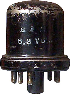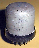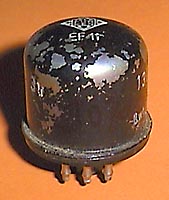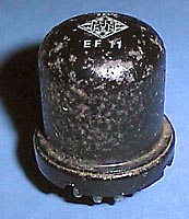 Das ist der Prototyp einer EF 11. Der Sockel hat 4 und 4 Stifte. Der Schlitz für das Abschirmblech im Sockel ist schon vorgesehen. Die Röhre trägt keine Entwicklungsnummer, aber noch lesbar die Aufschrift EF11 unf 6,3 Volt. Auf der Blechkappe ist der Telefunkenstern eingeprägt.