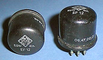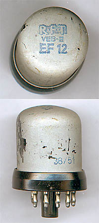EF 12, seit 1938 Nachfolgerin der AF 7. Hochfrequenzverstärkerröhre für Rundfunkempfänger. In Triodenschaltung auch als NF-Verstärker verwendbar. Heizung: 6,3 V und 0,2 A indirekt Anodenspannung: 250 V |