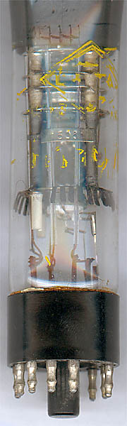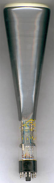 H 1 / 10, Opta, 10-poliger Stahlröhrensockel. Kathodenstrahlröhre mit elektrostatischer Ablenkung für Oszillografen. Heizung: 4 V, halbindirekt. Schirmdurchmesser: 10 cm Ablenkplattenpaare: 2 |