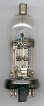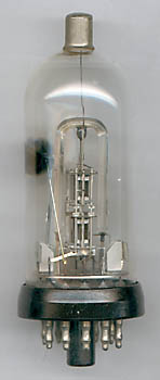 MR 01. Elektrometerröhre des Funkwerk Erfurt mit zehnpoligen Stahlröhrensockel. Zwei indirekt geheizte Raumladetetroden. Das Raumladegitter des oberen Systems ist mit der Kolbenkappe verbunden. Die beiden identischen Systeme verwenden eine gemeinsame Kathode. Wahrscheinlich wurden die beiden Systeme in Brückenschaltung verwendet und ergaben so die Möglichkeit, kleinste Spannungen zu messen. Weitere Daten nicht bekannt. |