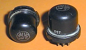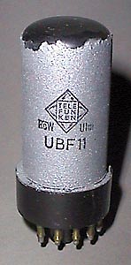UBF 11, seit 1939. Demodulator-Duodiode und regelbare Zwischenfrequenz-Pentode für Rundfunkempfänger. Heizung: 20 V und 0,1 A indirekte Serienheizung. Dioden (je System): Pentode: |