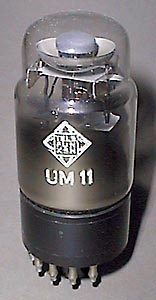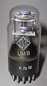 UM 11, ab 1939. Abstimmanzeige mit zwei Doppelfächern unterschiedlicher Empfindlichkeit für Rundfunkempfänger. Durch das Doppelsystem war die genaue Abstimmung auf Fern- oder Ortssender in gleicher Weise möglich. Heizung: 6,3 V und 0,2 A indirekt Leuchtschirm- und Betriebsspannung: 200 V Schirmbild: |