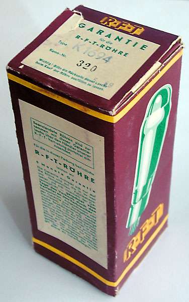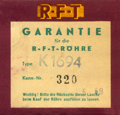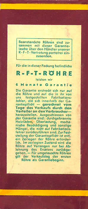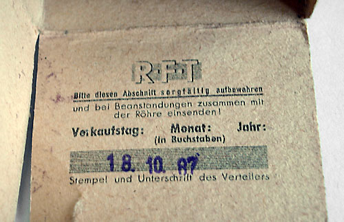 Auf dem Karton ist eine Kontrollnummer für die Garantie (320) aufgedruckt. Diese Nummer wiederholte sich auf der Röhre. Auf der Rückseite der Lasche wurde das Kaufdatum vermerkt. So war immer sichergestellt, dass nur die originale Röhre im Garantiefall zurückgegeben wurde. Diese Röhre wurde 1959 gefertigt und 1987 verkauft. | ![]() |