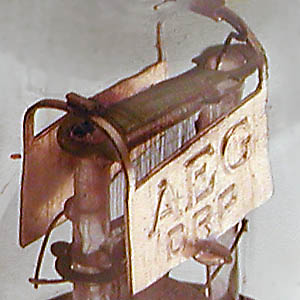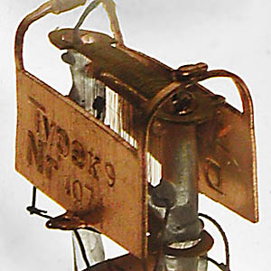 Auf den Anodenblechen ist die Seriennummer und Typenbezeichnung geprägt. Das Drahtgitter ist über dicke Kupferdrähte gewickelt.