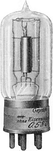 5-pol-Postsockel Gesamthöhe: 96 mm Heizung: 3,8...4 V und 0,5 A Ähnlich wie RE 73. Abbildung aus "Drahtlose Telegraphie" von J. Zenneck und H. Rukop, 5. Auflage 1925 |