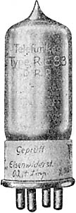 Telefunkensockel Höhe ohne Stifte: 90 mm Heizung: 2,2...2,7 V und 0,2 A Ähnlich wie RE 89. Abbildung aus "Drahtlose Telegraphie" von J. Zenneck und H. Rukop, 5. Auflage 1925 |