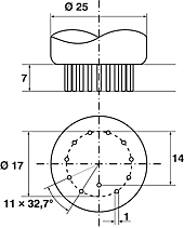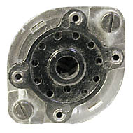 Achtstiftiger Gnomsockel mit zusätzlichem Mittelkontakt über die Führungsnase, die auf den Pumpstutzen aufgekittet ist. Die Abmessungen und Anordnung der Stifte und des Mittelzapfens entsprechen denen des Loktalsockels. Der äußere Blechkragen der Lokalröhre war hier an der Fassung angebracht.