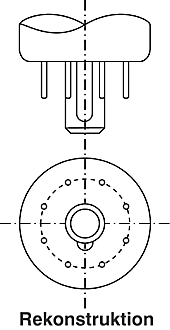 Wahrscheinlich gab es Schwierigkeiten mit dieser Konstruktion, weil der Pumpstutzen beim Einsetzen der Röhre leicht abbrach. Außerdem ist die elektrische Durchführung direkt am oder im Pumpstutzen fertigungstechnisch problematisch. |