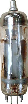 Viele grössere Röhren der 30er- und 40er-Jahre wurden auf der Kolbeninnenseite mit Graphit beschichtet. Die statische Aufladung der Kolbenwand wäre sonst so stark, dass der Elektronenflug innerhalb des Systems unkontrollierbar beeinflusst würde. Als die Röhren dann in den Abmessungen stark verkleinert wurden, war das Graphitisieren nicht mehr nötig. Ein Beispiel für eine innen mit Graphit beschichteten Röhre ist die EL 11. Foto: H.-T. Schmidt |