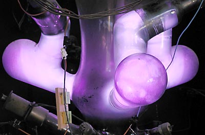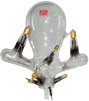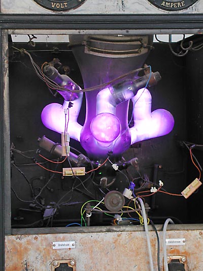 Im unteren Teil der Röhre befindet sich ein Quecksilbersee, die Kathode. Im Betrieb tanzt ein grünes Irrlicht umher; die Quelle der austretenden Elektronenstrahlen.