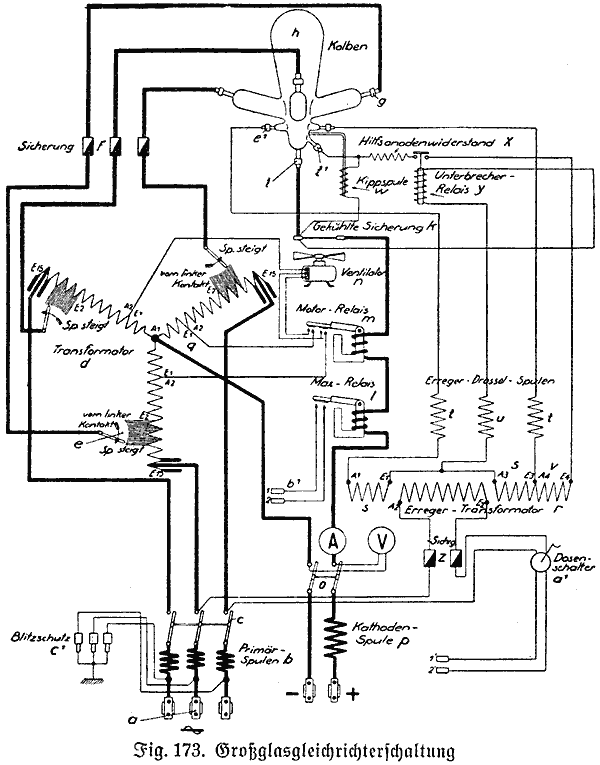Das Schema eines Grossgleichrichters der AEG haben wir in Fig. 173 vor uns. Ganz oben ist der Gleichrichter zu sehen mit drei Armen zum Anschluss der drei Phasen des Drehstromes. Verfolgen wir nun den Weg der Gleichrichtung vom Drehstrom bis zum fertigen Gleichstrom. Links unten bei a sind drei Klemmen für den Kabelanschluss der Drehstromseite. Von hier aus führen die Leitungen nach den Primärdrosselspulen b und zu einen dreipoligen Ausschalter c, der zum Ein- und Ausschalten des Gleichrichters dient. Vom Schalter führen die Leitungen zu dem sterngeschalteten Transformator d, der zur Regulierung dient. Durch die in jeder Phase eingezeichneten Kurbelschalter können Wicklungen zu- oder abgeschaltet werden, und damit kann die Phasenspannung reguliert werden. Über den Regulierungsschalter geht der Strom zu den Anodensicherungen F an die Anodenanschlüsse g des Gleichrichterkolbens h. in der Kathode i vereinigen sich die drei Halbwellen des Drehstroms zum Pluspol des Gleichstromes. Die Plusleitung führt über die Gleichstromsicherung k, über das Motorrelais m, das Maximalrelais l und das Amperemeter A zum zweipoligen Hebelschalter o. Das Motorrelais betätigt den Motor des Ventilators n, der zur Kühlung des Glasgefässes dient und den hierfür erforderlichen Luftstrom liefert. Da eine ordnungsgemässe und sichere Gleichrichtung von einer gleichmässigen Kühlung des Luftstromes abhängt, die je nach der Belastung wechseln muss, so ist dies Relais des Ventilatormotors für den Betrieb von Wichtigkeit. Vom Hebelschalter o führt die Leitung zur Gleichstromdrosselspule p und dann zur Plusklemme. Von der Minusklemme aus läuft der Strom zum Hebelschalter und von dort in den Nullpunkt q des Reguliertransformators. Dieser Nullpunkt dient in allen Fällen als Minuspol der Gleichstromseite. Dies ist die Haupteinrichtung des Gleichrichter. An Neben- bzw. Hilfsapparaten sind noch einige weitere erforderlich. Der Erregertransformator r besitzt die Wicklungen für die Hilfserregung und für den Zündstromkreis. Der Stromkreis der Hilfserregung besteht aus den Wicklungen s, den Erregeranodendrosselspulen t und der Erregerkathodendrosselspule u. Der Erregertransformator wird durch den Schalter a1 bzw. durch das Maximalrelais eines zweiten Gleichrichters, der mit dem ersten parallel arbeitet, eingeschaltet. Die Blitzschutzeinrichtung c1 dient dazu, etwa auftretende Überspannungn im Drehstromnetz nach der Erde abzuleiten und so die Isolation im Gleichrichter gegen Durchschläge zu schützen. Die Anordnung der Gleichstromdrosselspule p dient dazu, die bei der Gleichrichtung noch vorhandenen geringen Pulsationen auszugleichen. Aus: Die neuzeitliche Elektrotechnik von Curt Hanfland, 1928 |