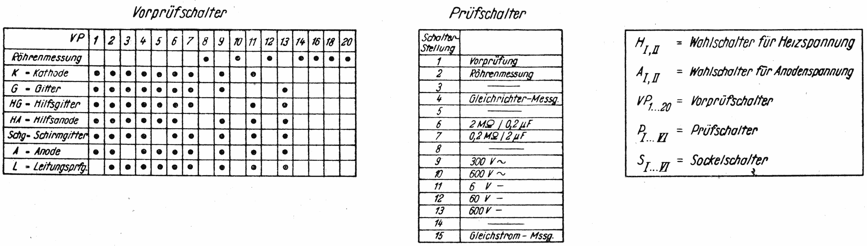 Hier werden kleine und negative Spannungen ohne wesentliche Strombelastung gebraucht. Von der 70-V-Wicklung geht’s auf die Signallampe SL2 (Überlastungsschutz) R3 (Vorwiderstand) und dem Selengleichrichter TGl auf den Ladeelko C6. Nun folgen zwei fast identische Wege für Steuergitterspannung und Hilfsgitterspannung. Der Poti P5 regelt die Steuergitterspannung. Über S3 und dem Instrument V3 kann diese gemessen werden. Die Bereichsumschaltung 5V/50V bewirkt S2. Es folgt die Möglichkeit, einen hochohmigen Widerstand für die Vakuumprüfung einzutasten (R14/Vakuumprüftaste). Nun gehts weiter über den Vorprüfschalter VP16 und dem Sockelschalter SV an das Steuergitter der Röhre. Der Poti P4 regelt die Hilfsgitterspannung. Über S3 und dem Instrument V3 kann diese gemessen werden. Die Bereichsumschaltung 5V/50V bewirkt S2. Nun gehts weiter über den Vorprüfschalter VP14 und dem Sockelschalter SIII an das Hilfsgitter der Röhre. Kathode: Hier werden die Massepunkte der oben genannten drei Spannungsversorgungen zusammengefasst. Über den Vorprüfschalter VP20 gelangt man auf den Kathodentesttaster, der die Verbindung zur Kathode unterbricht. Über VP 18 und dem Sockelschalter SI gehts zur Kathode. Heizspannungen: Hier werden wahlweise zwei Spannungen erzeugt: H1/H2 greifen zwei symmetrische, aber entgegengesetzte Spannungen ab. Die Spannungsangaben hier am Trafo stimmen nicht und sind durch Zwei zu teilen. Die 0-V-Leitung des Trafos führt zur Kathode. Die Angriffe an H1/H2 führen zur Heizung der Röhre. Über die Buchsen B5 kann die Spannung auch entnommen werden. (Für eine Heizspannungsmessung kann das auch notwendig sein). Dreht man H1/H2 weiter, erhält man höhere, aber unsymmetrische Spannungen für Serienheizung. Der Strom wird mit P6 geregelt und mit dem Dreheiseninstrument mA1 überwacht. Sockelschalter: SI...SVI ordnet die sechs verschiedenen Spannungen den Fassungsanschlüssen zu. Da der Schalter 15 Stellungen hat, sind pro Fassung nur Röhren mit maximal 15 verschiedenen Sockellayouts prüfbar. Diese sind fest durch die Verdrahtung des Sockelschalters vorgegeben. In den Einstelltabellen ist die richtige Stellung bei der Röhrentype notiert. Röhren mit anderen Sockellayouts sind nicht prüfbar, es sei den, man wendet einen Adapter an, der die Zuschaltung von Fassungskontakten frei erlaubt (Kreuzschienenverteiler oder fliegende Verdrahtung). Vorprüfung: Es wird eine Schlussprüfung durchgeführt. Weitere Messungen: Es können noch weitere Messungen in der Art eines Multimeters durchgeführt werden. Der Umschalter hierfür ist PI...PVI. Der Messwert wird im Hauptinstrument mA2 angezeigt. Zum Anschluß dienen verschiedene Buchsen, die entsprechend gekennzeichnet sind. Der Graetzgleichrichter in der Mitte des Schaltplan wird nur für externe Messungen gebraucht. |