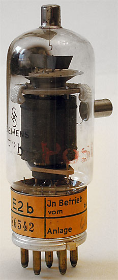 Die E2b wurde ab 1937 eigens für das Siemens-B200-System entwickelt und gefertigt. Es war das erste Breitbandverstärkersystem der Reichspost, mit dem je ein Fernsehkanal und 200 Telefongespräche über je ein Koaxialkabel in jeder Richtung übertragen wurden. Für die Öffentlichkeit spektakulär war der Fernsehsprechdienst, ein öffentliches Fernsehtelefon. Wer es sich leisten konnte, durfte mit einer der vorhandenen Sprechstellen in Berlin, Leipzig, Nürnberg und München in Bild und Ton kommunizieren. Die Strecke wurde bewusst so gewählt, dass wichtige Ereignisse, wie die Leipziger Messe oder der Nürnberger Reichsparteitag im neuen Medium Fernsehen übertragen werden konnten. Weitere Strecken nach Hamburg, Frankfurt und Wien, sowie zu den Fernsehsendern Feldberg und Brocken wurden nicht vollendet. Die Fernseh-Breitbandverstärker, die im Mittel alle 17,5 km geschaltet waren, wurden wesentlich mit der E2b bestückt. Die gesamte Bandbreite betrug 4 MHz. Im Krieg wurde die Anlage für zivile Nutzung gesperrt und Luftlagebilder der Funkmessstellen (RADAR) in entferntere Kommandostellen übertragen. Im Sommer 1945 müssten Deutsche Kriegsgefangene die Anlage für die Russen demontieren. Sie sollte zwischen Moskau und Leningrad (heute: St. Petersburg) wieder errichtet werden, was aber wegen umfangreicher Sabotage nicht mehr gelang (Zeitzeugenbericht). Von dem B200-System sind heute nur noch wenige Fragmente vorhanden. Später wurde die E2b mit veränderter Heizung und Sockelung zur E 2 c weiter entwickelt. Die Weiterentwicklungen waren wesentlich leichter und billiger herzustellen, hatten aber auch ungünstigere Kapazitätswerte. Breitband-Verstärkerpentode Heizungsdaten: 18 V und 0,36 A; indirekte Heizung |