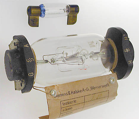 Die Anode ist U-förmig gebogen, darin das Gitter in Form einer Drahtwendel. Der Heizfaden ist gerade durch das System gespannt. Heizung: 3,6 V und 2,1 A Röhre in Kommunikationsmuseum Berlin. |