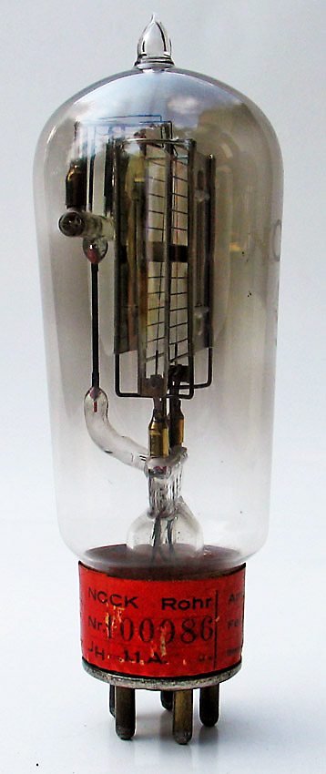 5-poliger-Poströhrensockel. Auf dem Glaskolben steht NOCK, auf der roten Banderole NOCK Rohr , Nr.100086 , IH = 1,1A. Die Seriennummernzählung begann offensichtlich erst ab 100000; also ist dies die 86ste Röhre. Die NOCK ist extrem selten. Sie ist der technische Nachfolger der OCK und der konstruktive Prototyp der Ca und wurde von Siemens Austria (rote Banderole) hergestellt. Das Erscheinen datiere ich auf kurz vor Einführung der Ca, also kurz vor 1935. Der Typenname läßt sich sinnvoll als Neue OCK deuten. Nachfolger wurde die Ca.