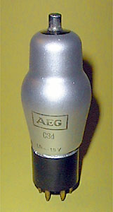 AEG um 1943 Hochfrequenz-Endpentode Ähnlich wie C 3 e, aber anderer Sockel Heizungsdaten: 18 V und 0,24 A; indirekte Heizung |