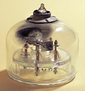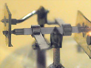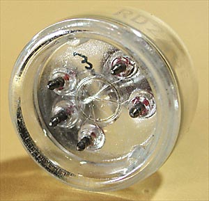 <=== Das weisse Kathodenröhrchen und die beiden Diodenanoden. Der Abstand zwischen den beiden Glimmerplättchen beträgt knappe 9 mm. ===> |