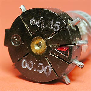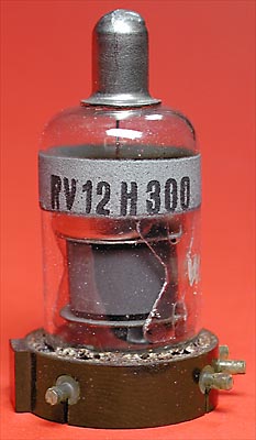 | Blick auf die RV 12 H 300. In dem dreieckigen Loch rechts ist noch etwas rote Farbe enthalten. Die gehört zu einer Farbmarkierung, die helfen sollte, gleichartige Röhren in gestecktem Zustand zu unterscheiden. Denn diese Patronenröhren waren leicht zu verwechseln. |