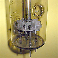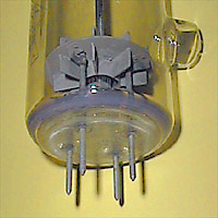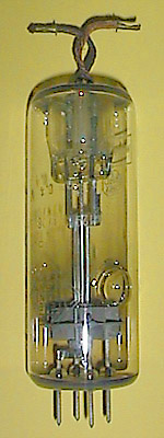 Impulssendetriode mit Gittertastung bis 50 cm. Unten ist die gefächerte Blechanode zu erkennen. Die beiden Kupferbänder oben sind die Heizungsanschlüsse. Beim Einbau wurden sie mit Keramikperlen isoliert. Als die LS180 eingeführt wurde, war der Pressteller noch neuartig. Er war unbedingt notwendig, weil die Röhre ja bis 50 cm arbeiten sollte und daher kurze Verbindungen zu Gitter und Anode brauchte. Andererseits war die Presstellertechnologie noch nicht so weit entwickelt, daß die Durchführungen starke Ströme vertrugen. Daher der Quetschfuss mit den Heizerzuleitungen auf der anderen Seite. Eine LS180 mit Graphitanode kam zu Ende des Krieges heraus. Die Form der Anode war so kompliziert, daß es unwirtschaftlich wurde, sie aus Blech herzustellen. Aus einem Graphitblock ließ sie sich aber leicht heraus schneiden. Ein anderer Vorteil war die höhere Überlastbarkeit, was zu einer längeren Lebensdauer führte. Die LS180 diente zur Impulserzeugung für die frühen deutschen Radargeräte (Würzburg). Diese liefen Anfangs ohne Magnetrons in den Sendern, weil man irrtümlicherweise Zentimeterwellen nicht für notwendig hielt und Kobalt, ein Grundstoff für die Herstellung von starken Dauermagneten kaum aufzutreiben war (Embargo!). |